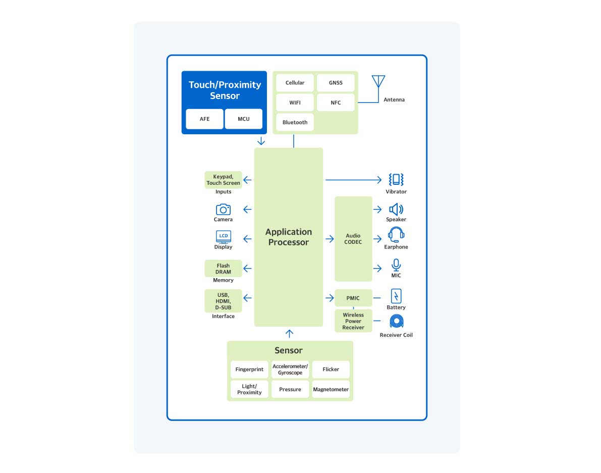 现代单片机的触摸/接近传感器提供高性能Grip 感应电路和超小封装低功耗性能。可以感应人体是否接近智能手机,并降低人体暴露在电磁波辐射,符合智能手机电磁波吸收率标准认证。