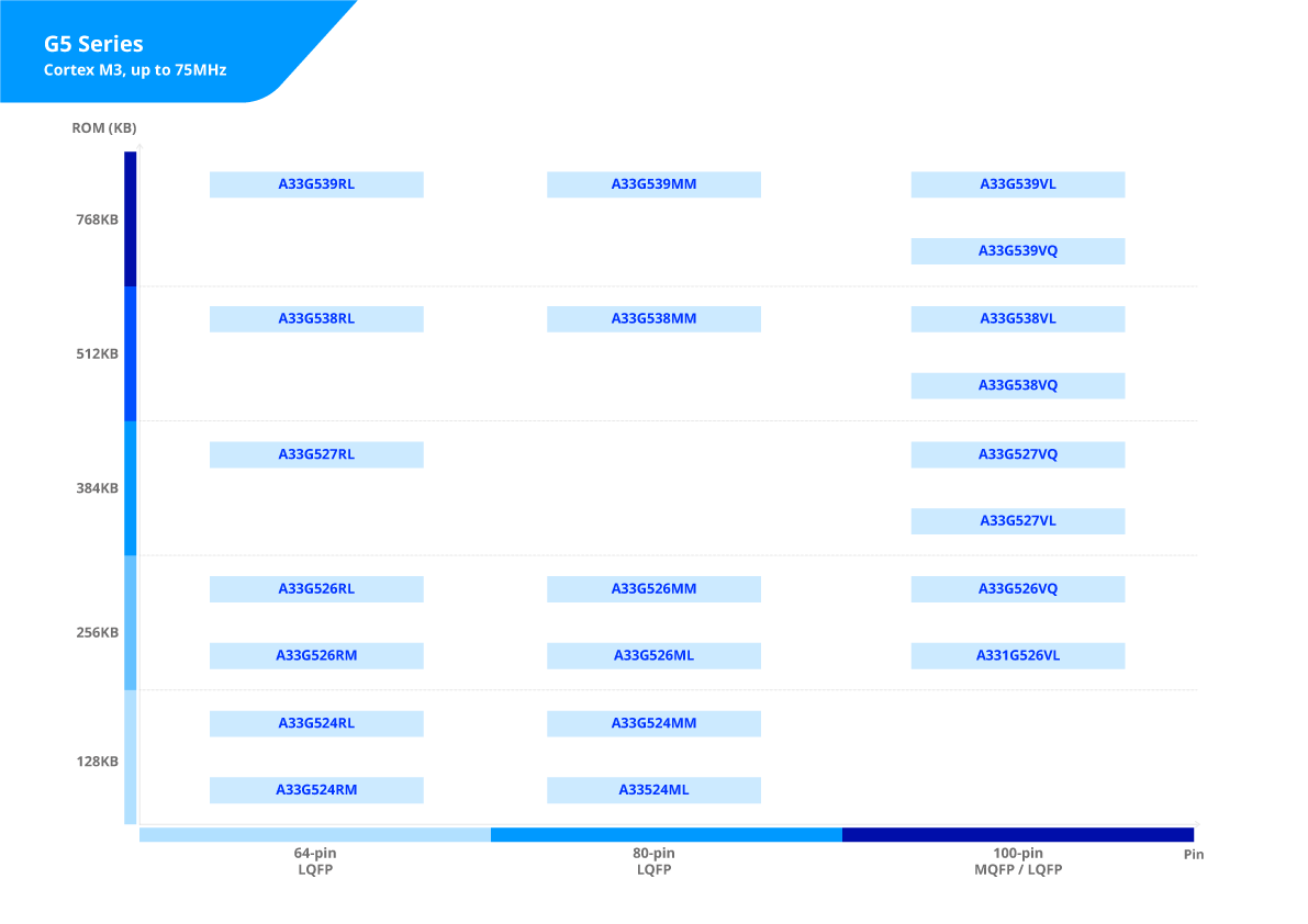▶ A33G53x : Max. 768KB Flash memory / 24KB SRAM / Max. 32KB DATA Flash; Communication: UART(4-ch)/SPI(2-ch)/I2C(2-ch)