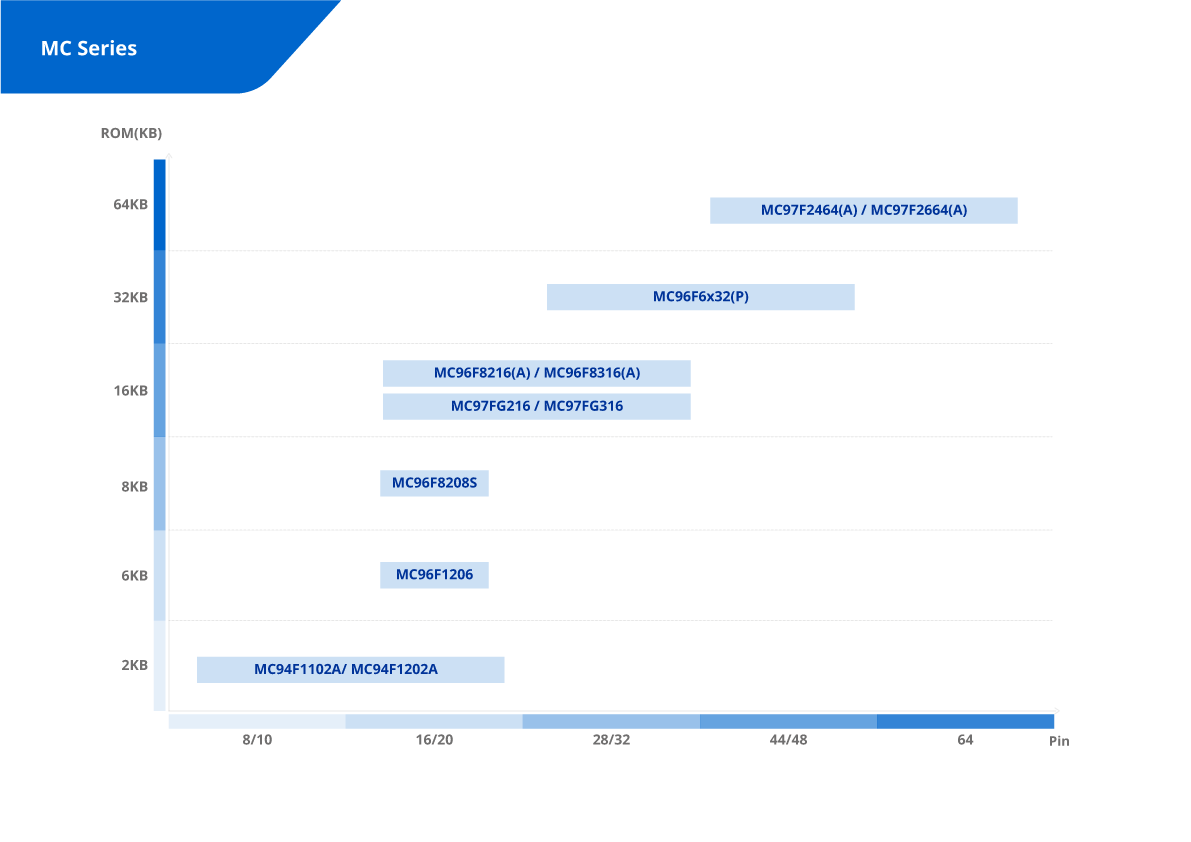 ▶ MC96F6432P : 32KB Flash memory/ 12-bit x Max.16-ch ADC/ 1-ch UART, 1-ch SPI