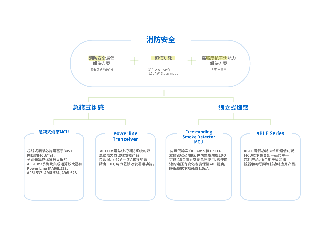 - 总线式烟感芯片是基于8051内核的MCU产品,分别是集成运算放大器的 A96L3x2系列及集成运算放大器和 Power Line 的A96L523, A96L533, A96L534,A96L623。