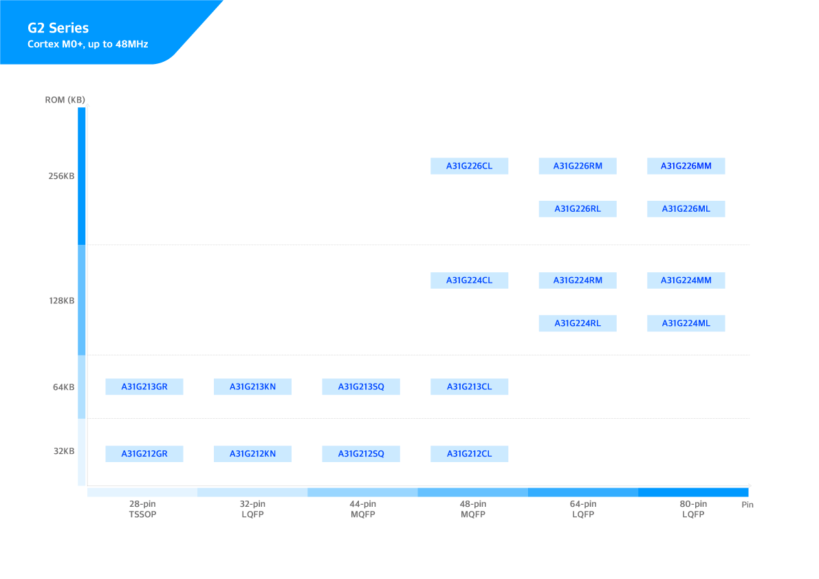 ▶ A31G22x : Max. 256KB Flash memory/ 20KB SRAM/ 32KB DATA Flash/ LED, LCD Driver/ Firmware Over-the-air function, Communication: USART(Max. 4-ch)/ UART(2-ch)/ I2C(Max. 3-ch)/ SPI(2-ch)