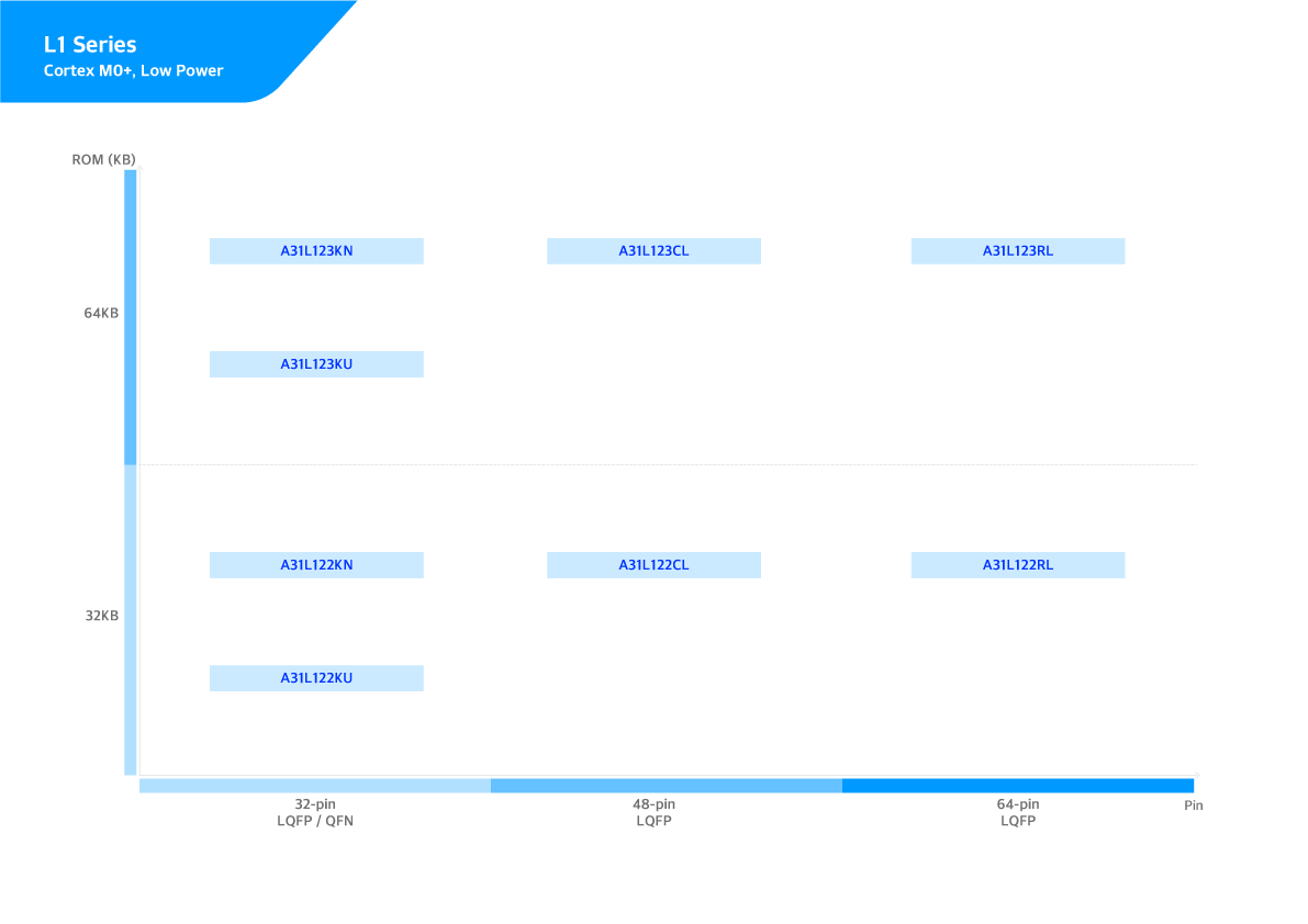 Devices in ABOV Semiconductor’s Cortex®-M0+-based 32-bit L1 Series deliver 32-bit performance including external communication and deep sleep mode, along with Ultra Low Power (ULP) function. L1 series can be applied to various battery operated applications.