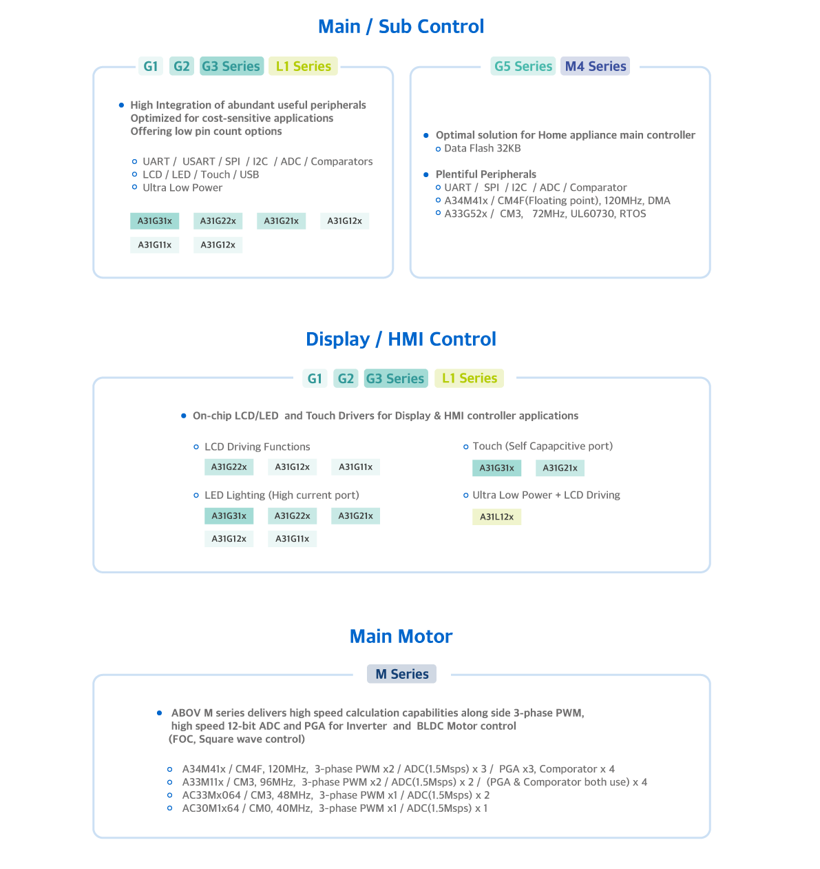 现代单片机有丰富的主控 & 显示控制应用产品线, 具有最佳成本效率的方案 (G1系列), 高集成度 HMI (G2, G3 系列), 超低功耗及丰富外围设备(L1系列), 提供针对家电主控最佳功能 (G5系列), 高性能及 Advanced Integration(M4系列). 代表性的应用产品为洗衣机, 冰箱, 空调等白色家电,微波炉, 热水器, 电磁炉等智能家电。