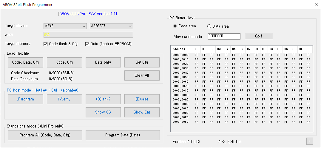 aFlasher32支持使用A-Link或A-LinkPro调试接口对ABOV的32位微控制器进行编程,对于A-LinkPro,还提供独立模式的HEX文件编程功能。