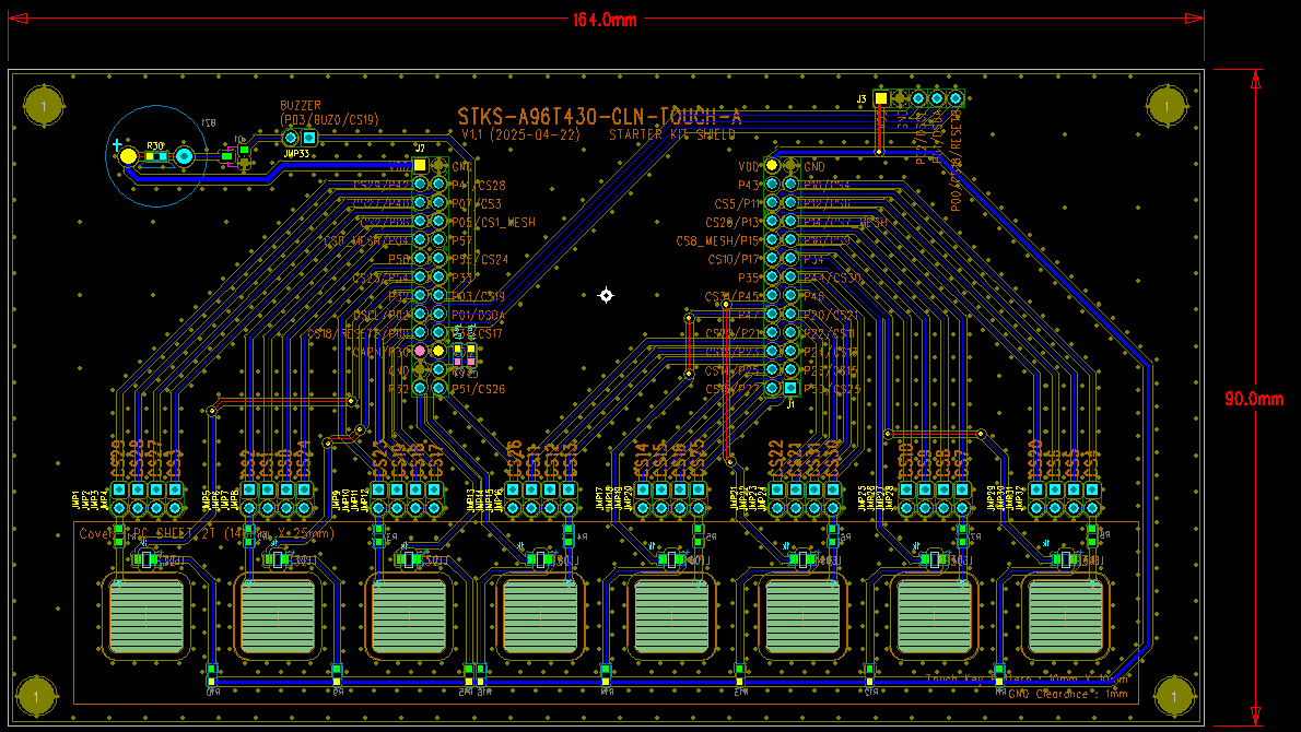Starter Kit Shield Board_A96T430CL2N 是用户连接 A96T430 Starter Kit 使用的扩展板 . 将触控相关函数做成库文件,提供容易上手的UI. 基于 A96T430 MCU 的 Shield Board ,包含了 Touch key , LED Driver, Buzzer,可连接扩展板使用.