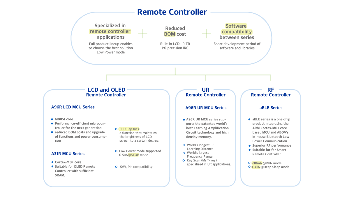 - ABOV’s LCD Remote Controller MCU mainly supports Segment LCD Driver, Push Button, and digital interfaces like SPI, UART and I2C. In addition, it provides Power Management and Low Power mode (0.5uA@Stop mode) to optimize the battery life.