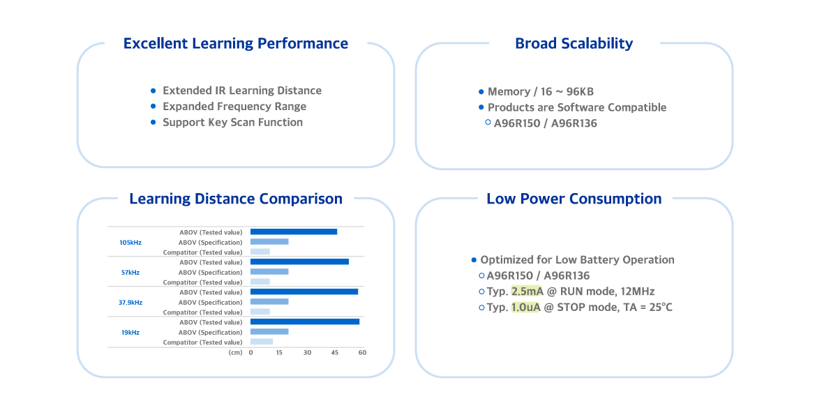 - ABOV’s A96R UR series supports a patented IR Learning Function which shows world’s best performance (World’s Longest IR Learning Distance and World’s Largest Frequency Range).