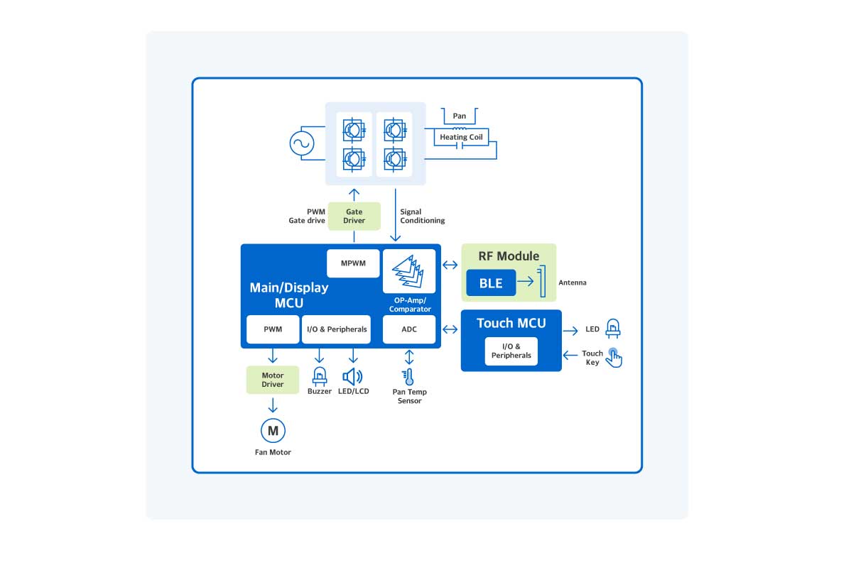 ABOVはインダクションクッカーに適したMCU製品ファミリを幅広く取り揃えています。当社の高性能MCUは、IHインバータ制御とADCのための高度なパルス幅変調(PWM)機能をサポートし、さまざまなセンサ入力を処理します。