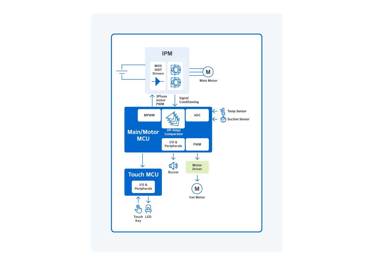 ABOVのモーターMCUは、吸引とメインおよびディスプレイを制御できます。ABOVのタッチMCUには、自立型騒音防止タッチエンジンが含まれています。 コンシューマーの目的に応じて、8~12チャンネルの論理タイプまたは8~24チャンネルのMCUタイプに設定することができます。