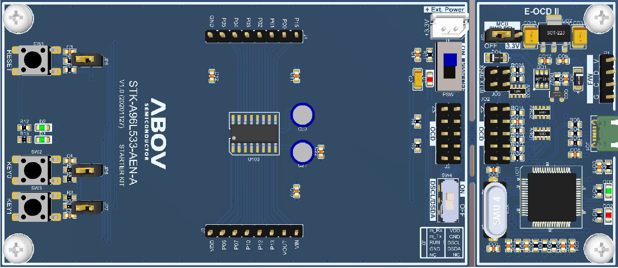 This Starter Kit is based on A96G616 MCU, and includes LED, Push Button, built-in E-OCD II interface for debugging and USB connector. |