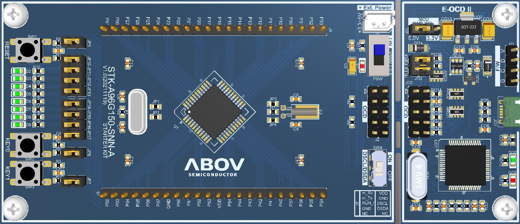 StarterKit-A96G616LD2N supports users to develop applications required for A96G616 series MCUs.