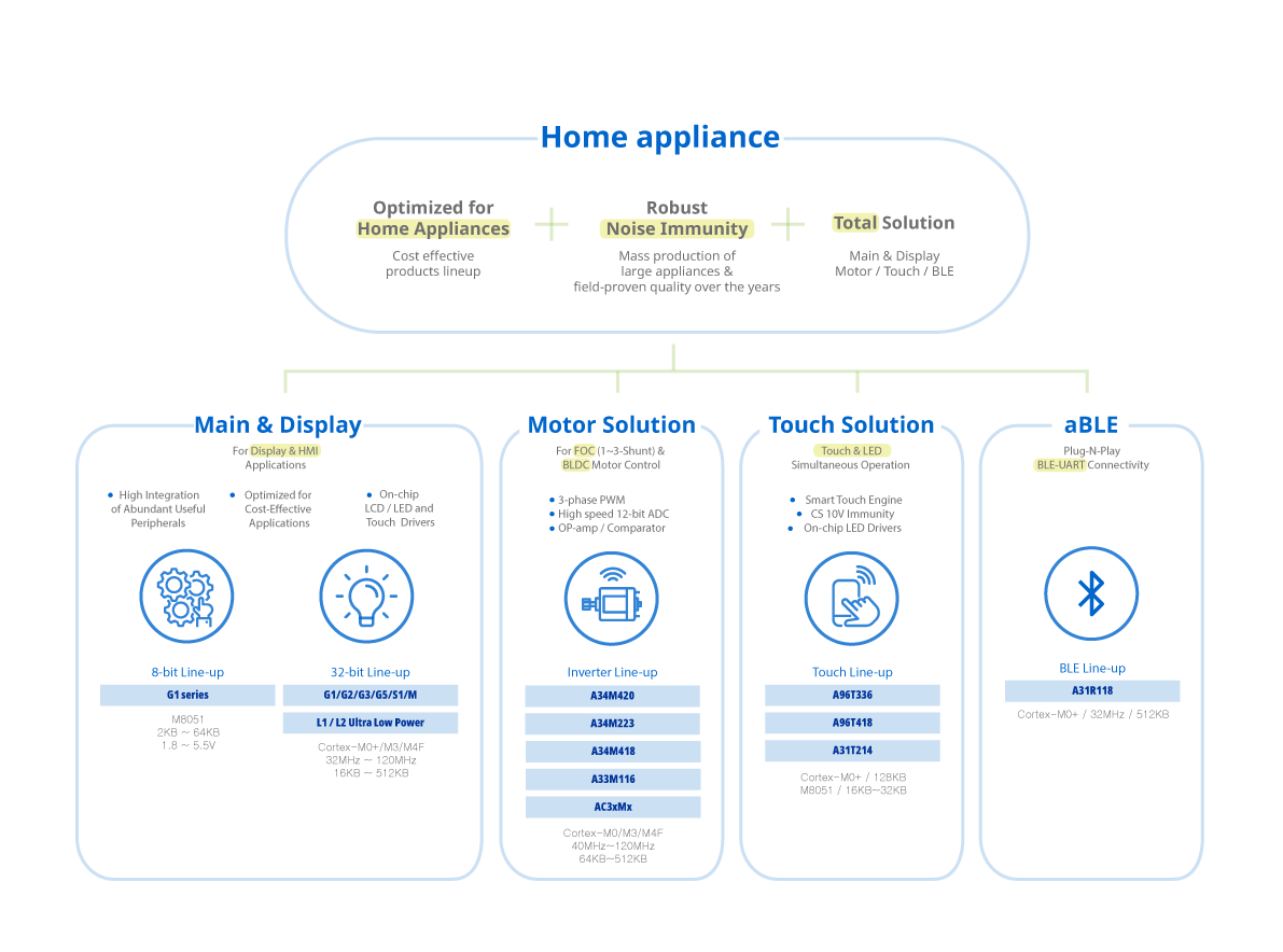 - 어보브반도체는 Main stream & Display 응용의 풍부한 Lineup을 갖추고 있으며, 비용 효율성을 갖춘 최적의 솔루션(G1시리즈), High Integration HMI (G2, G3 시리즈), Ultra Low Power 및 고급 주변기기(L1 / L2 시리즈), Home Appliance Main Controller에 대한 최적의 기능 제공(G5시리즈), 고성능 및 Advanced Integration(M4시리즈)를 제공하고 있습니다. 대표적인 응용은 세탁기, 냉장고, 에어컨 등 백색 가전, 전자레인지, 열수기, IH cooker등 Smart Home Appliance에 활용하고 있습니다.