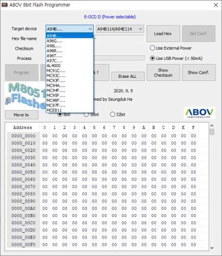 aFlasher8은 Windows PC 용 8 비트 Flash Downloader 프로그램입니다. E-OCD II 디버그 인터페이스를 통해 ABOV의 8 비트 마이크로 컨트롤러를 지원합니다. aFlasher8은 추가 프로그램없이 바이너리 16 진수 파일을 마이크로 컨트롤러로 프로그래밍 할 수있는 편리한 도구입니다.