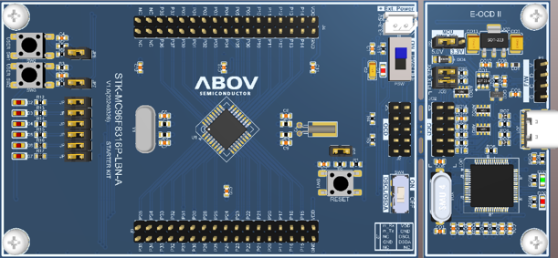 Starter Kit_A96S174FRN는 사용자가 A96x174(A96G174, A96S174) 시리즈를 사용할 때 필요한 애플리케이션을 개발할 수 있도록 지원합니다. A96S174 MCU를 기반으로 하고, LED, 푸시 버튼이 포함되어 있으며, 디버그용 E-OCD Ⅱ 인터페이스 및 USB 커넥터가 내장되어 있습니다.